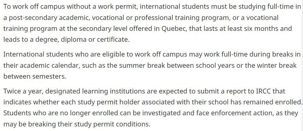 To work off campus without a work permit, international students must be studying full-time ina post-secondary academic, vocational or professional training program, or a vocationaltraining program at the secondary level offered in Quebec, that lasts at least six months andleads to a degree, diploma or certificate.
