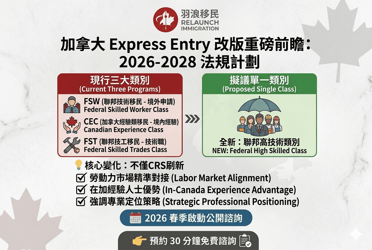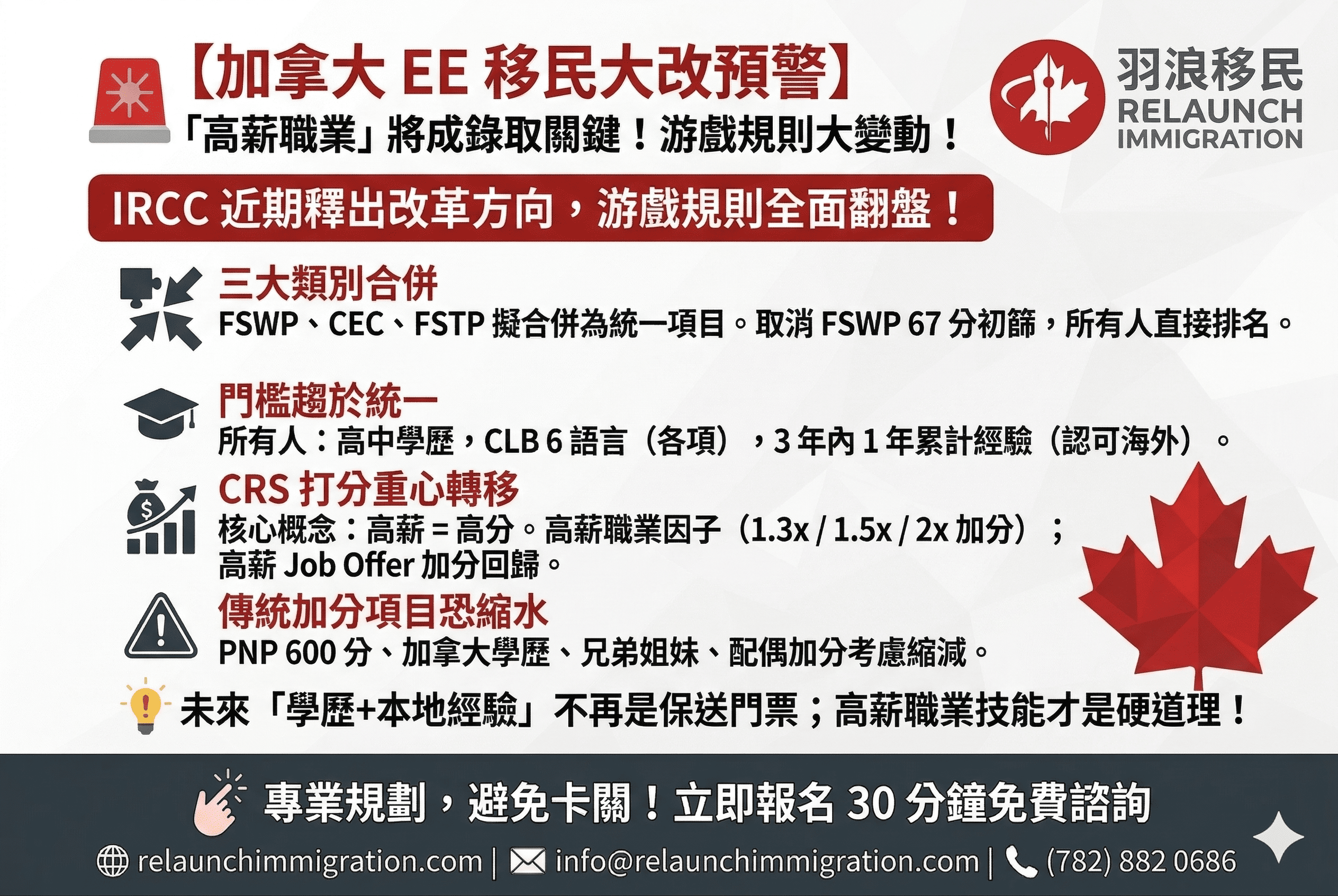 如果您正準備透過 Express Entry (EE) 申請永居,請務必注意。IRCC 剛釋出的 2026-2028 規劃顯示,這套運行十年的系統將迎來史上最大規模的「洗牌」......