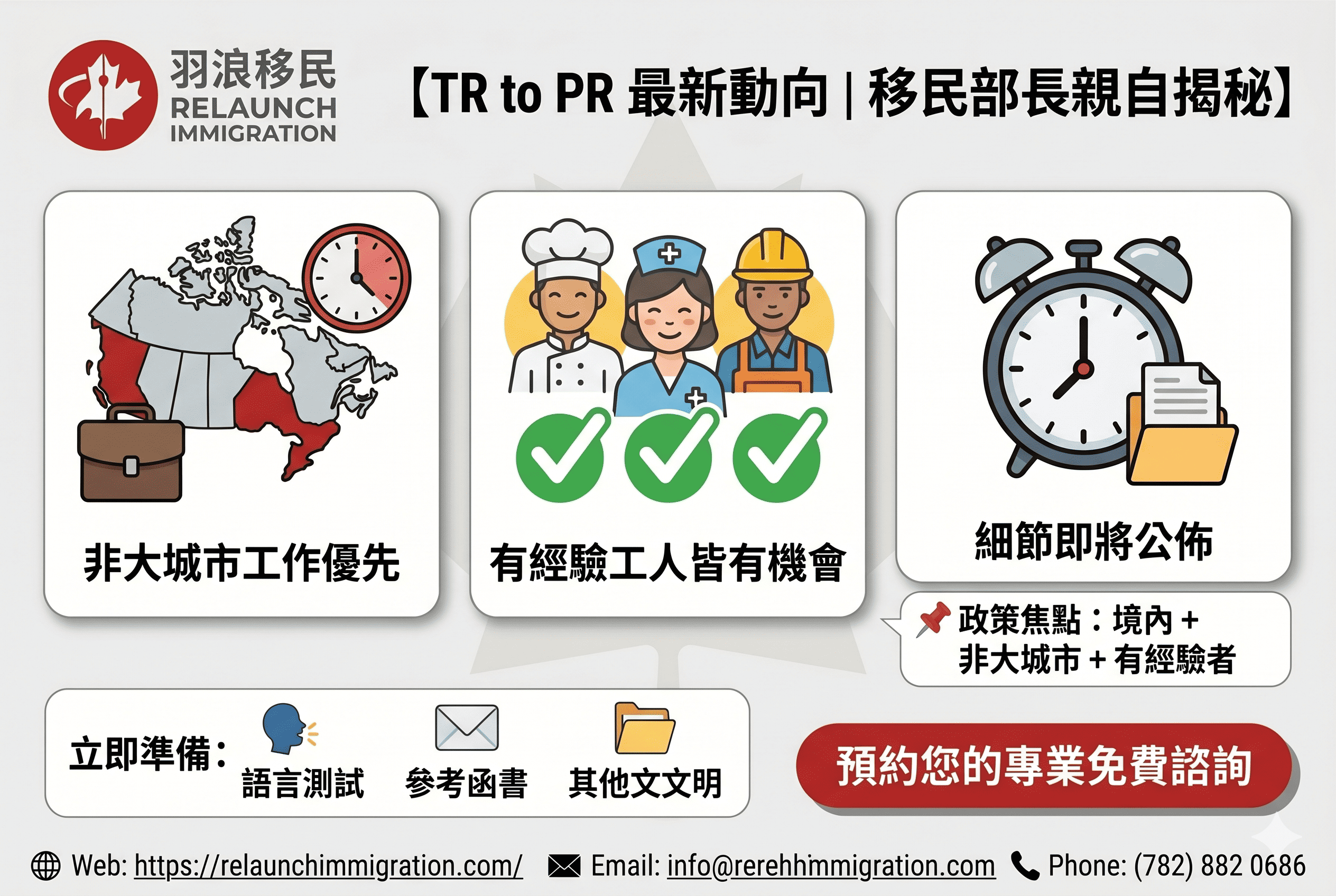 💡 助手提醒: 目前政策仍處於「訊號釋放階段」,最終細則(如職業清單、語言門檻)仍需以 IRCC 官網公布之正式文件為準。